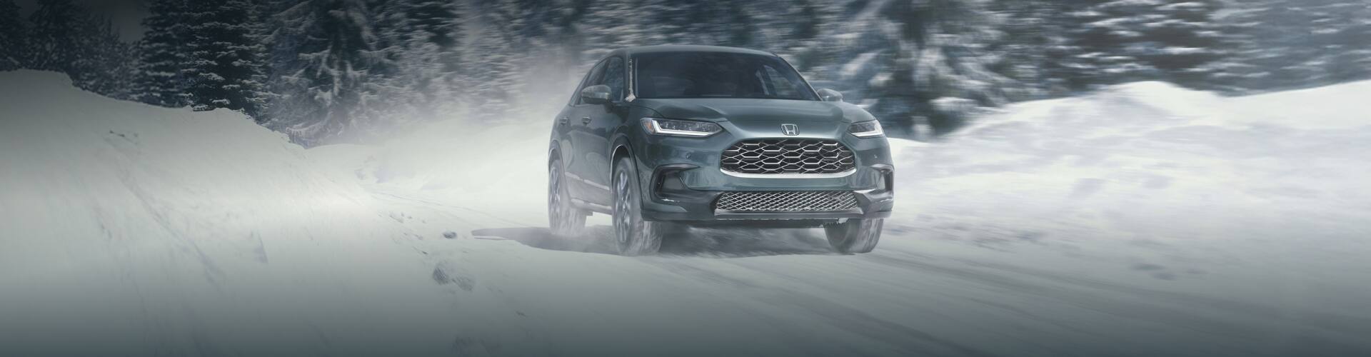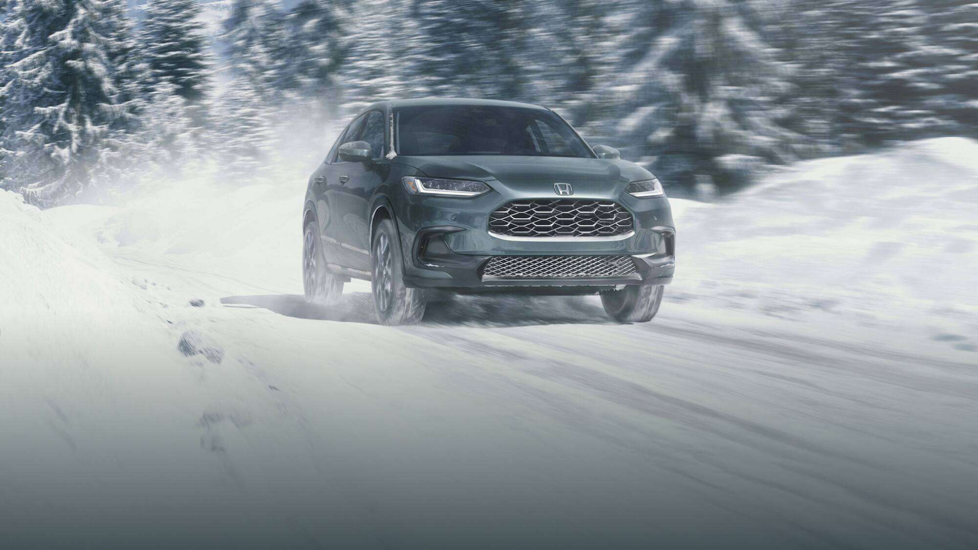 2027 Honda HR-V EX-L in Nordic Forest Pearl front view driving on a snowy road (Subcompact Crossover SUV).